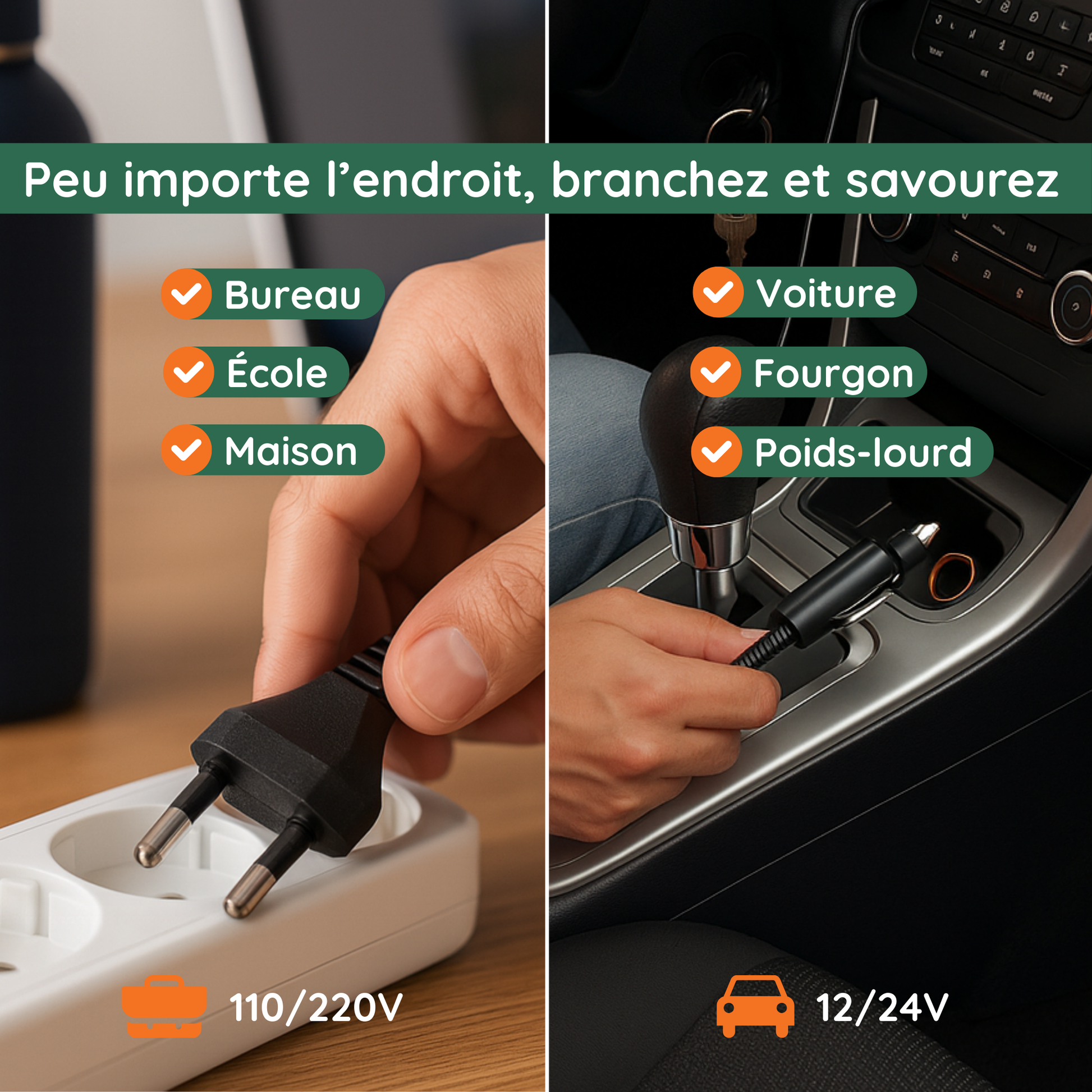 - Compatibilité : 110V / 220V (secteur), 12V (voiture), 24V (camion)